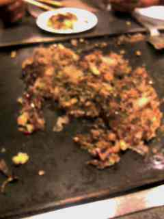男二人掛かりで焼いて、出来上がったお好み焼きの図