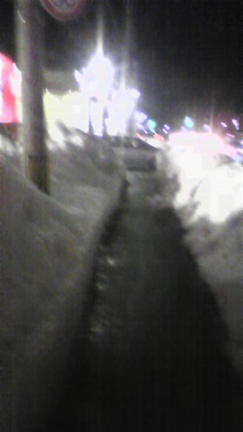 しかし、バス停までの歩道は夜は融雪が止まっていて、歩道は凍っている。